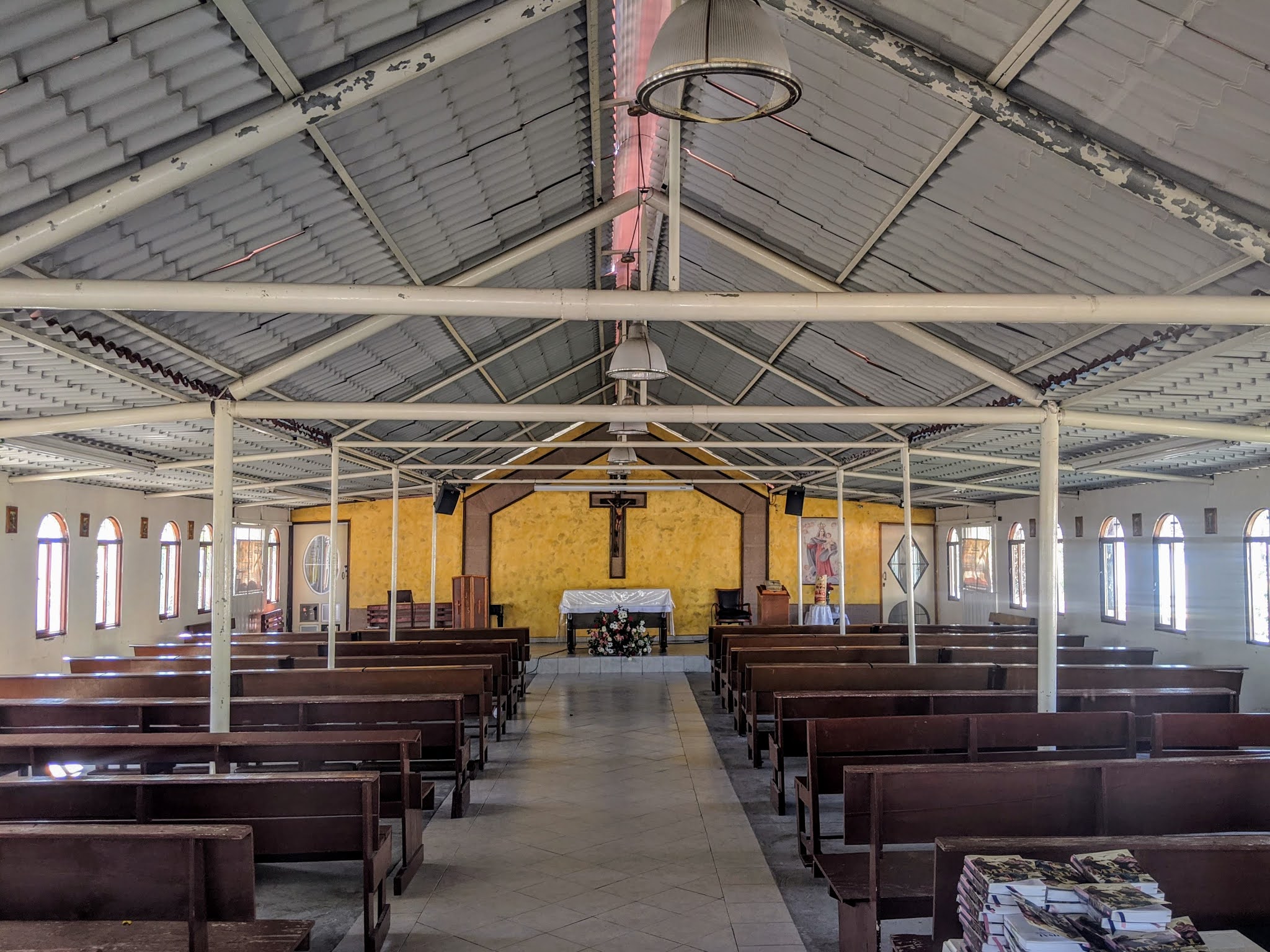 Es un templo pequeño de planta rectangular con techo de lámina a dos aguas. El ábside es muro liso color ocre, con algunos detalles en beige. Al centro hay un crucifijo.