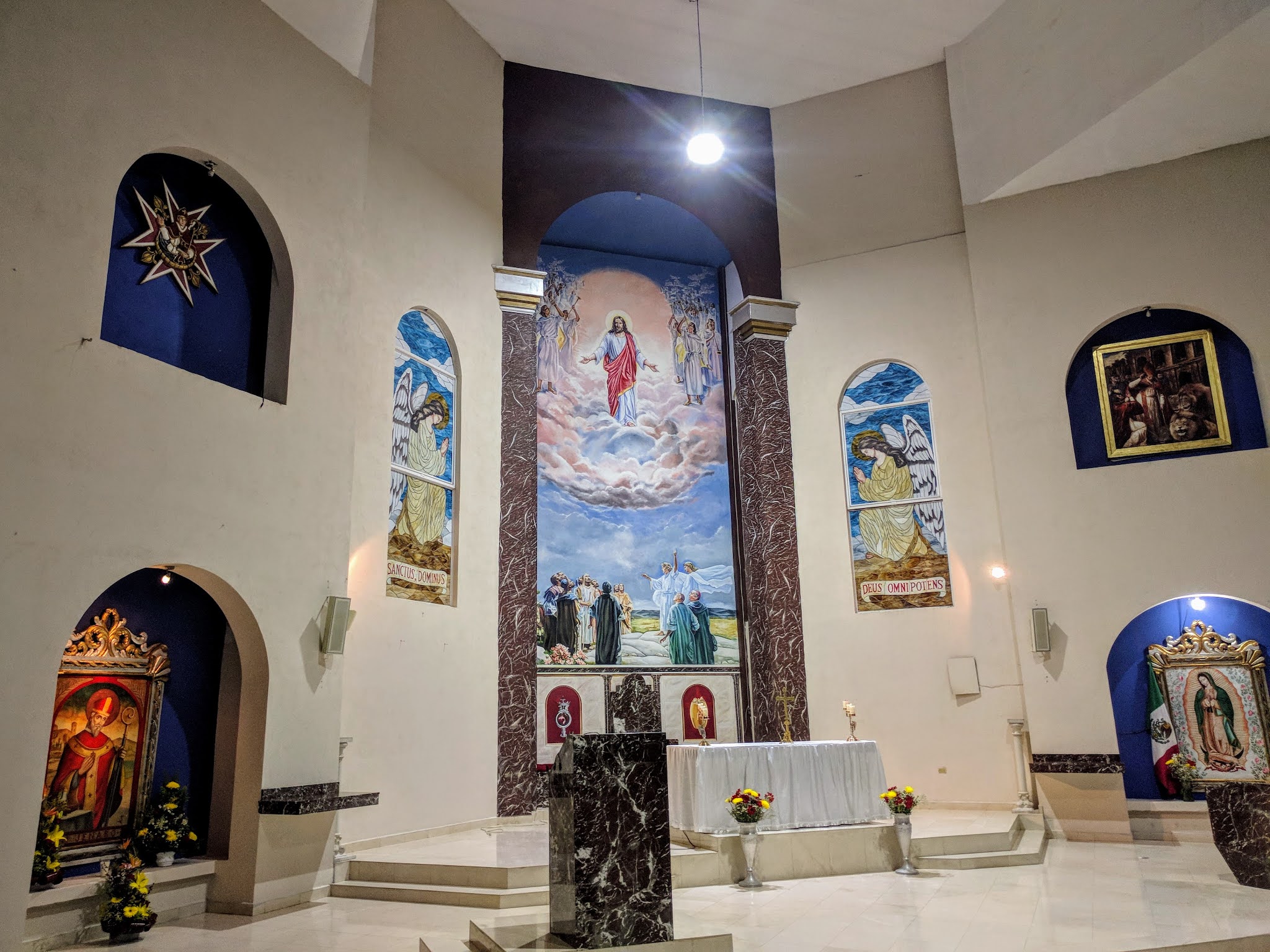 El interior también es muro beige. Al centro del templo las paredes se empiezan a cerrar en ángulo, hasta llegar al ábside un poco antes de hacer punta. En el presbiterio hay cuatro huecos de fondo azul con pinturas, además de dos vitrales con Ángeles. El ábside está enmarcado por dos columnas y un arco, tiene un gran mural con Jesús entre las nubes con un grupo de ángeles, y personas en la tierra.